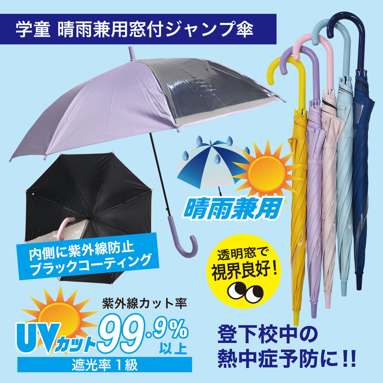 窓付タイプのブラックコーティング子供用日傘。UVカット率・遮光率99%以上の晴雨兼用タイプ(遮光率1級)。カラーは豊富な5種類。登下校の熱中症対策に最適!