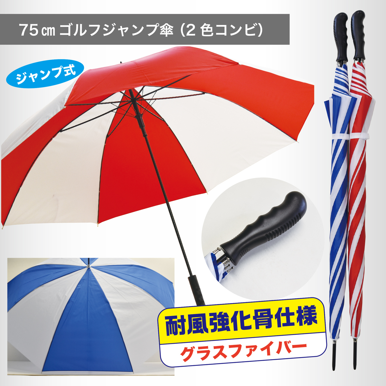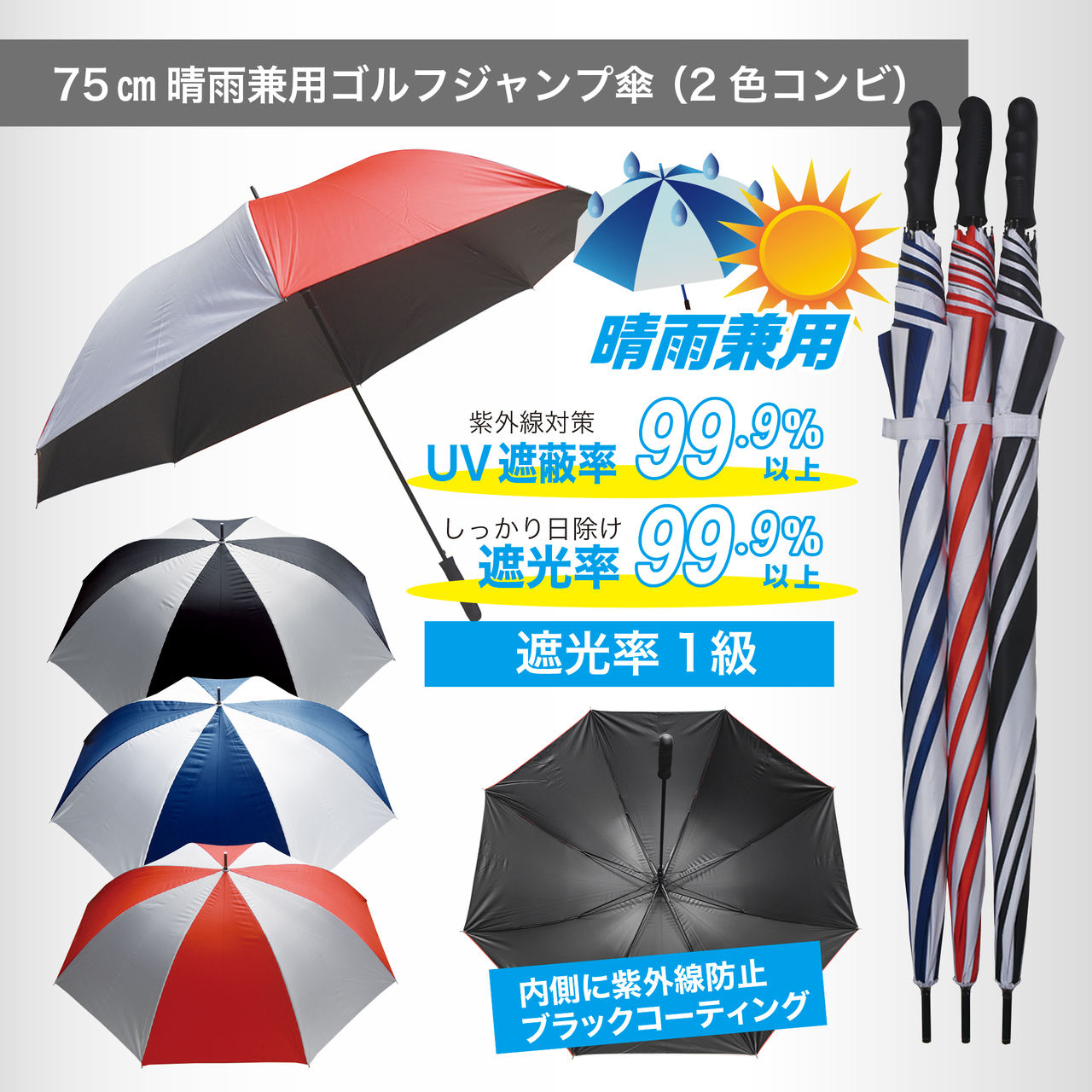 晴雨兼用シルバーコートゴルフジャンプ傘。シャフトや骨組み全てにグラスファイバーを使用した高強度ハイスペックモデル。紫外線防止のシルバーコート仕様。手元は握りやすいラバー手元を採用しました。サイズは65㎝と77㎝の2種類ご用意しております。