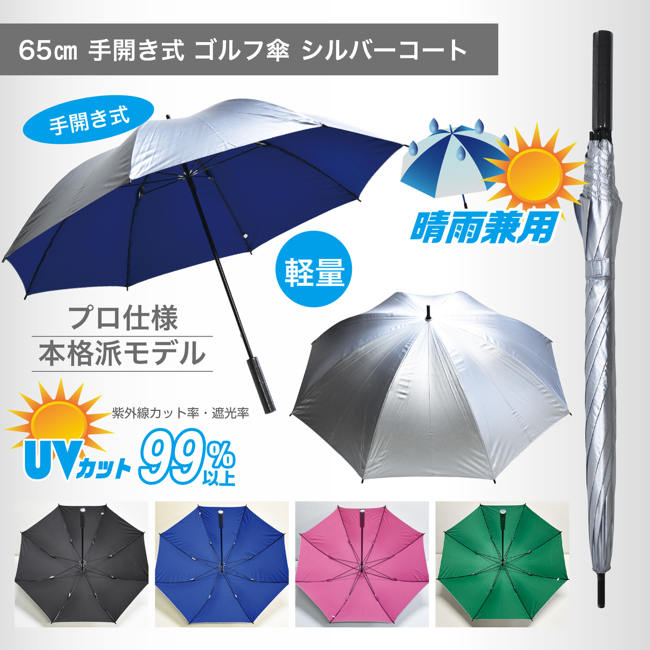 シルバーコート仕様の晴雨兼用65㎝手開き式ゴルフ傘。軽くて錆びにくい!さらにグラスファイバー骨で折れにくい!12㎜アルミシャフト採用で軽量化したプロ仕様の本格派モデル。
